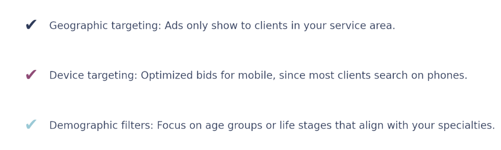 Combined with a negative keyword list, this ensures you attract real clients—not wasted clicks